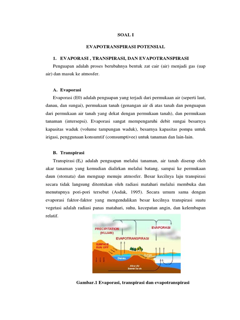 Evaporasi adalah proses perubahan molekul di dalam keadaan cair (contohnya air) dengan spontan menjadi. Adapun faktor yang mempengaruhi evaporasi adalah suhu, tekanan, viskositas cairan, dan adanya. Evapotranspirasi adalah gabungan evaporasi dan transpirasi tumbuhan yang hidup di permukaan bumi. Tak lain dari pertemuan sebelumnya penulis akan kembali dengan membawa dan memberi sebuah artikel. Penguapan atau evaporasi adalah jalur utama bahwa air bergerak dari keadaan cair kembali ke siklus air sebagai uap.